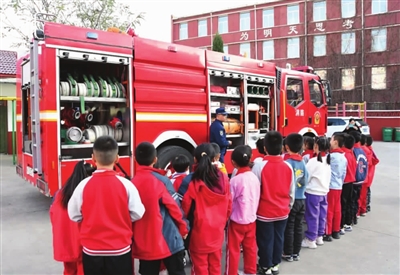 11月21日,团区委联合区少工委、段南沟社区,在段家背小学开展“‘青’力护航 情暖童心”关爱困境儿童活动。图为矿区消防救援大队消防员为孩子们讲解消防器材的名称、用途及使用方法。荆 昭摄