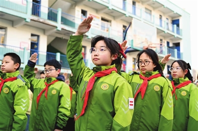 南楼小学少先队员敬队礼,眼神中满是对新学期的憧憬。刘 婕摄